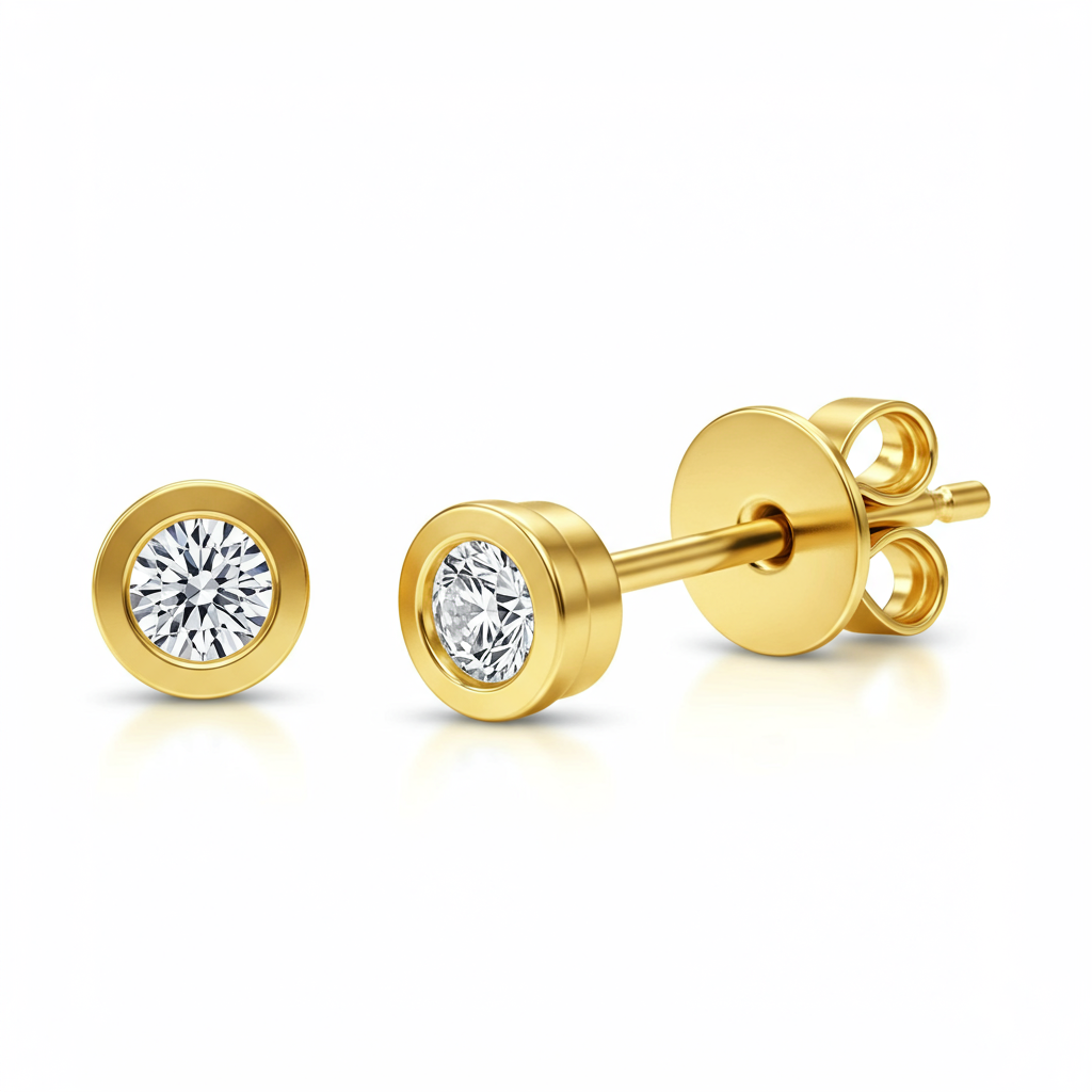 These delicate 18KT yellow gold stud earrings are designed specifically for young wearers, featuring a secure screw-back closure and a charming, polished setting. Each earring is illuminated by a brilliant VVS G-color diamond centerpiece, providing maximum sparkle with minimal size. Crafted with hypo-allergenic properties, these studs ensure comfort and safety for sensitive skin. They represent the perfect heirloom quality gift to mark a special milestone in a child's life.