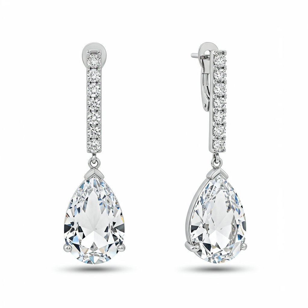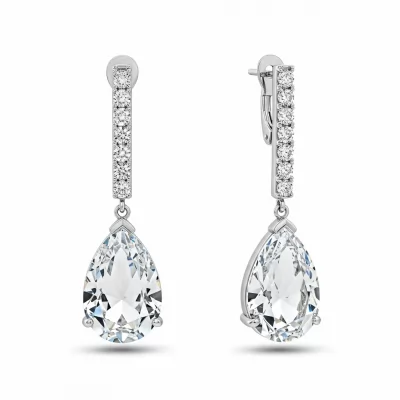 These exquisite drop earrings showcase the unparalleled brilliance of synthetic crystal, framed within sophisticated high-polished settings. Crafted in luxurious 18KT white gold, the design features a stunning pear-shaped focal point that catches light from every angle. Accentuated by high-quality pave diamonds, the earrings offer a mesmerizing sparkle and luxurious aesthetic. They are the perfect statement accessory for glamorous events or special occasions, promising timeless elegance and exceptional craftsmanship.