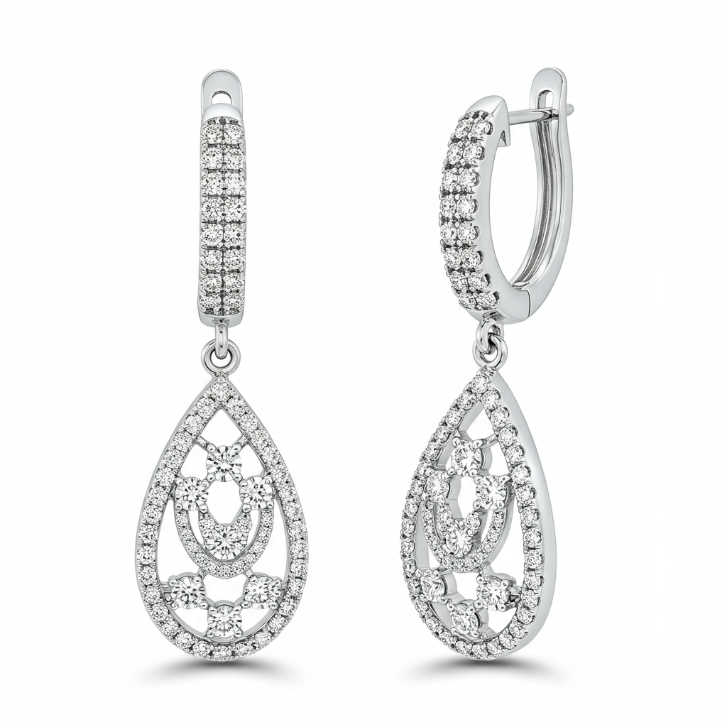These exquisite white gold drop earrings embody contemporary elegance and timeless sparkle. Crafted in highly polished 18KT white gold, they feature a graceful silhouette meticulously set with brilliant-cut diamonds. The articulate design ensures comfortable wear while maximizing movement and light refraction. The overall aesthetic creates a dazzling display of sophistication, perfect for formal events or elevating everyday luxury to new heights.