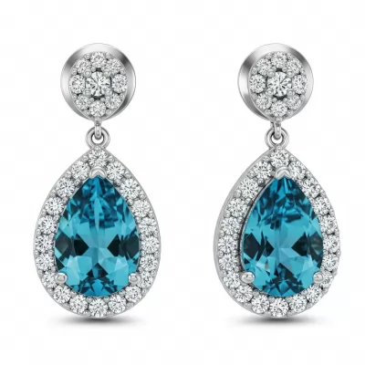 These exquisite Blue Stone Drop Earrings capture the deep allure of the ocean. Each earring features a magnificent pear-cut blue gemstone cradled within a brilliant double halo of perfectly matched VVS diamonds. Crafted in lustrous 18KT white gold, the delicate articulation ensures graceful movement and breathtaking sparkle with every turn. This pair is designed for the sophisticated wearer seeking timeless elegance and vibrant color.