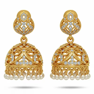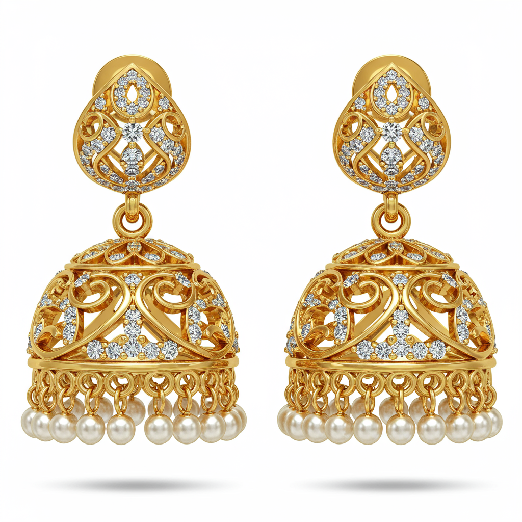 These exquisite 18KT yellow gold Jhumka earrings are a testament to traditional Indian craftsmanship, reimagined for the modern collector. The dome structure is meticulously detailed with pave-set VVS diamonds, creating a dazzling canopy of light. Delicate strands of shimmering Basra pearls dangle gracefully from the base, lending fluid movement and timeless elegance. These earrings are perfect for ceremonial occasions, embodying heritage and luxury in every detail.