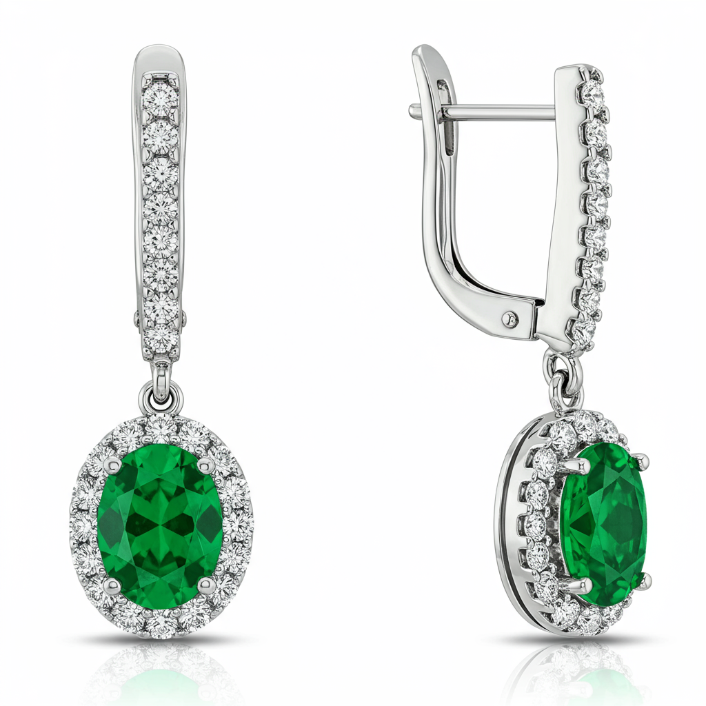 These exquisite drop earrings capture the lush vibrancy of nature with flawless craftsmanship. Each earring features a centerpiece, vibrant oval-cut natural emerald, framed by brilliant micro-pave diamonds. Set in radiant 18KT white gold, the design achieves a perfect balance of classical elegance and modern sophistication. They are secured with a delicate latch back, ensuring comfortable wear while delivering dazzling movement. This pair is an essential statement piece for any sophisticated evening event.