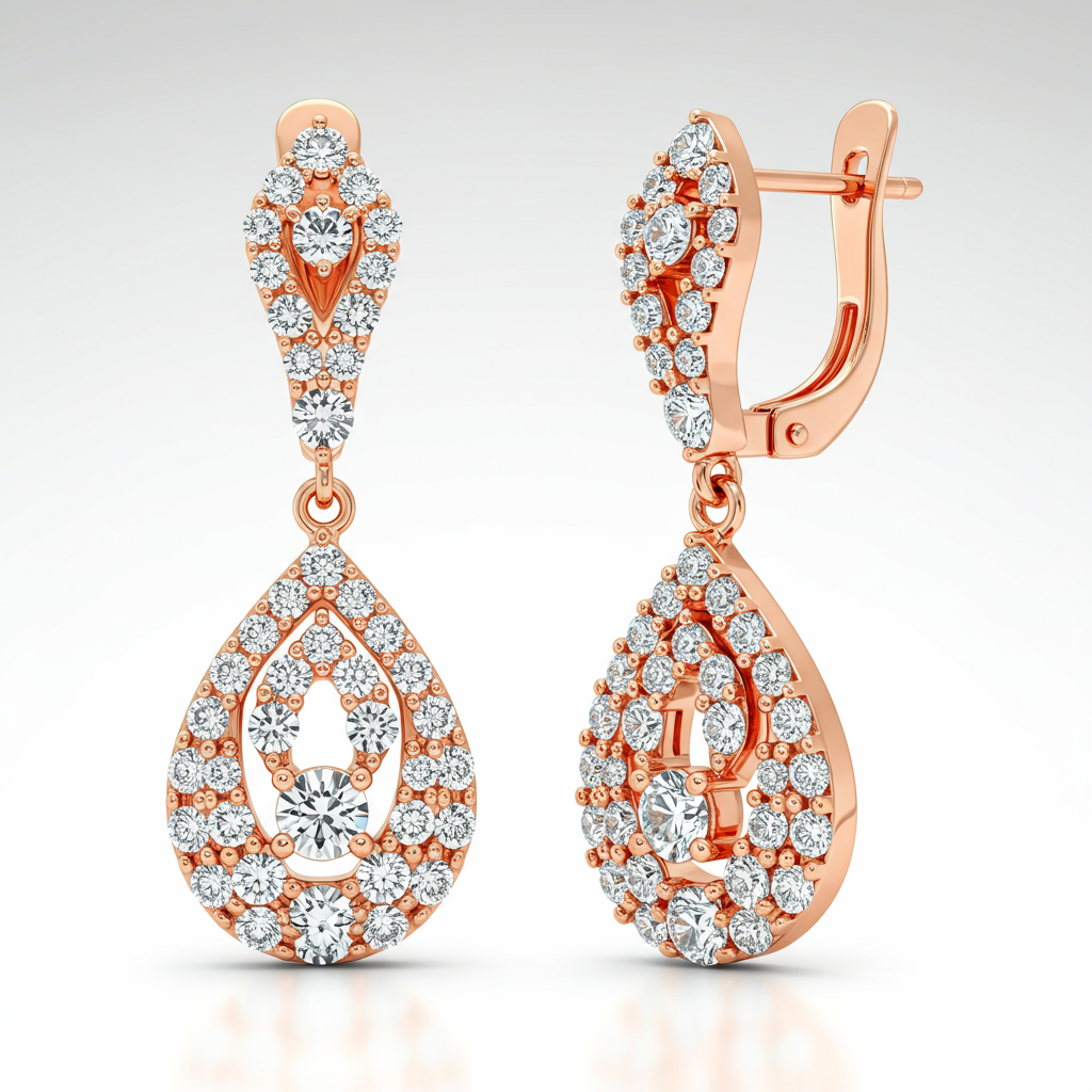 These exquisite meesho earrings showcase modern elegance crafted in radiant 18KT Rose Gold. Featuring an intricate drop design, they are meticulously set with brilliant-cut VVS diamonds that capture light from every angle. The fluid silhouette and sophisticated sparkle make them a perfect accessory for both formal events and elevated daily wear. They represent the pinnacle of luxurious, contemporary jewelry design.