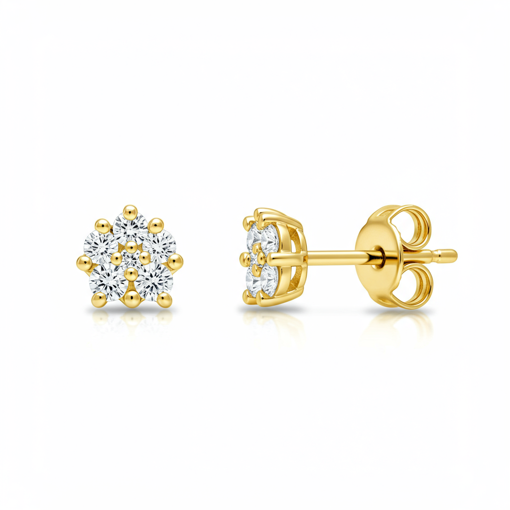 These luxurious baby earrings are meticulously crafted in 18KT yellow gold, ensuring hypoallergenic wear and gentle comfort for the youngest ears. Featuring a delicate cluster of VVS diamonds, they offer maximum brilliance in a secure, minimized setting. This timeless design is perfect for marking a special occasion like a baptism or first birthday. The high polish finish reflects light beautifully, making these exquisite studs a cherished heirloom piece.