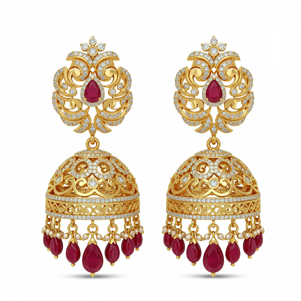 The Bahubali Chandelier Earrings are a magnificent testament to regal Indian design, capturing the grandeur of ancestral jewelry. Crafted in opulent 18KT gold, these large, multi-tiered drops are completely blanketed in brilliant-cut diamonds using meticulous pave setting techniques. This breathtaking statement piece drapes elegantly, offering unparalleled sparkle and movement for the most special occasions. Subtle accents of ruby enhance the royal aesthetic, making this a true heirloom jewel.