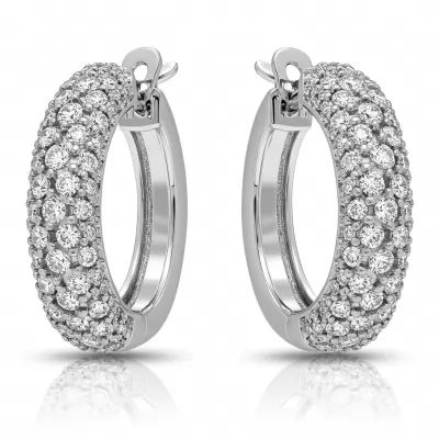 These exquisite Bali earrings capture the spirit of intricate craftsmanship with a modern diamond appeal. Crafted in luxurious 18KT white gold, the delicate hoop design is meticulously paved with brilliant round diamonds. This pair offers a sophisticated sparkle perfect for both daily wear and elegant evening occasions. They are secured with a hinged back closure ensuring comfort and security.