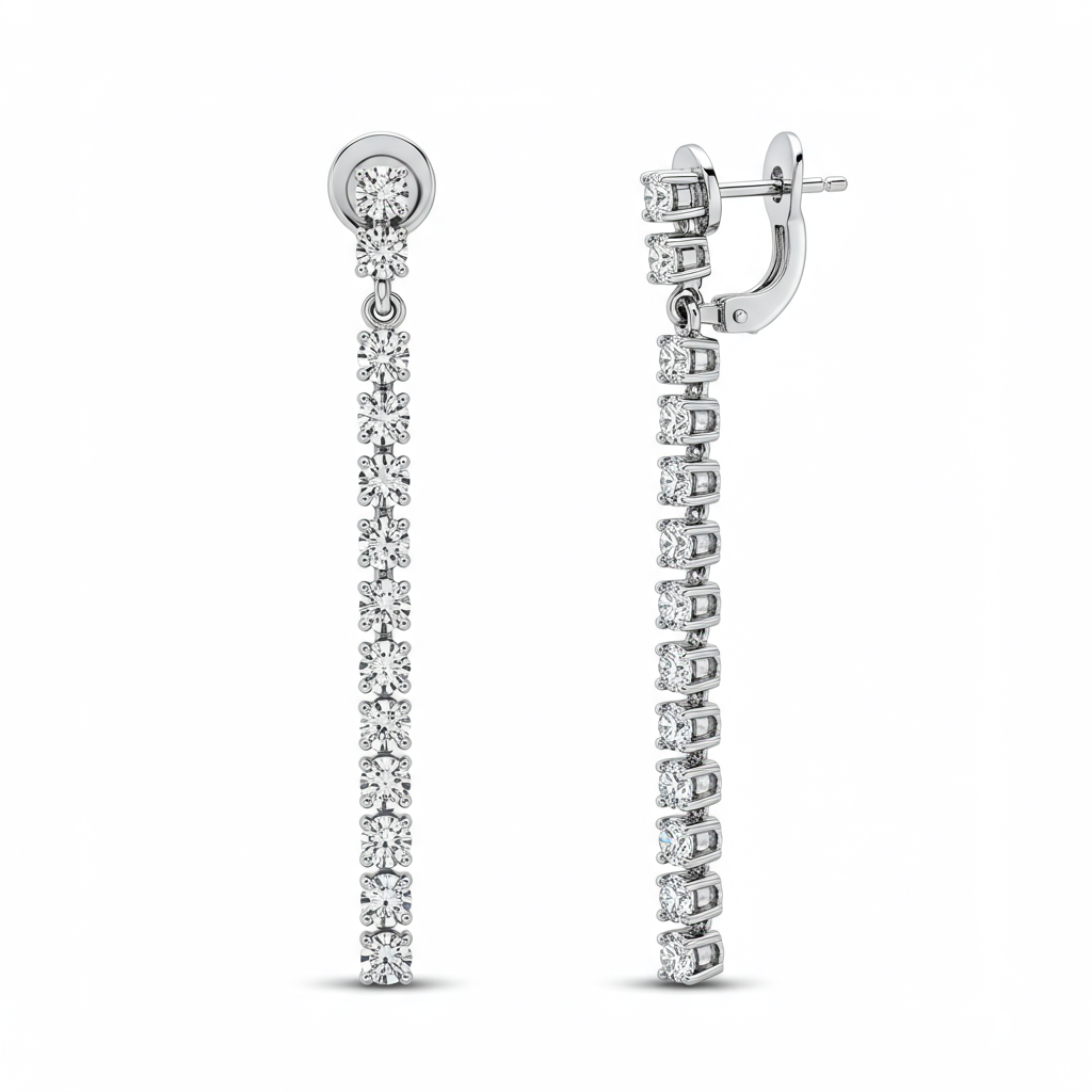 These elegant diamond dangler earrings capture eternal movement and brilliance. Crafted in exquisite 18KT white gold, they feature a delicate, articulated drop design that sways gracefully with every turn of the head. Each earring is meticulously set with VVS grade round brilliant diamonds, ensuring maximum fire and sparkle. A true statement of sophistication, these earrings are perfect for formal events or elevating everyday luxury.