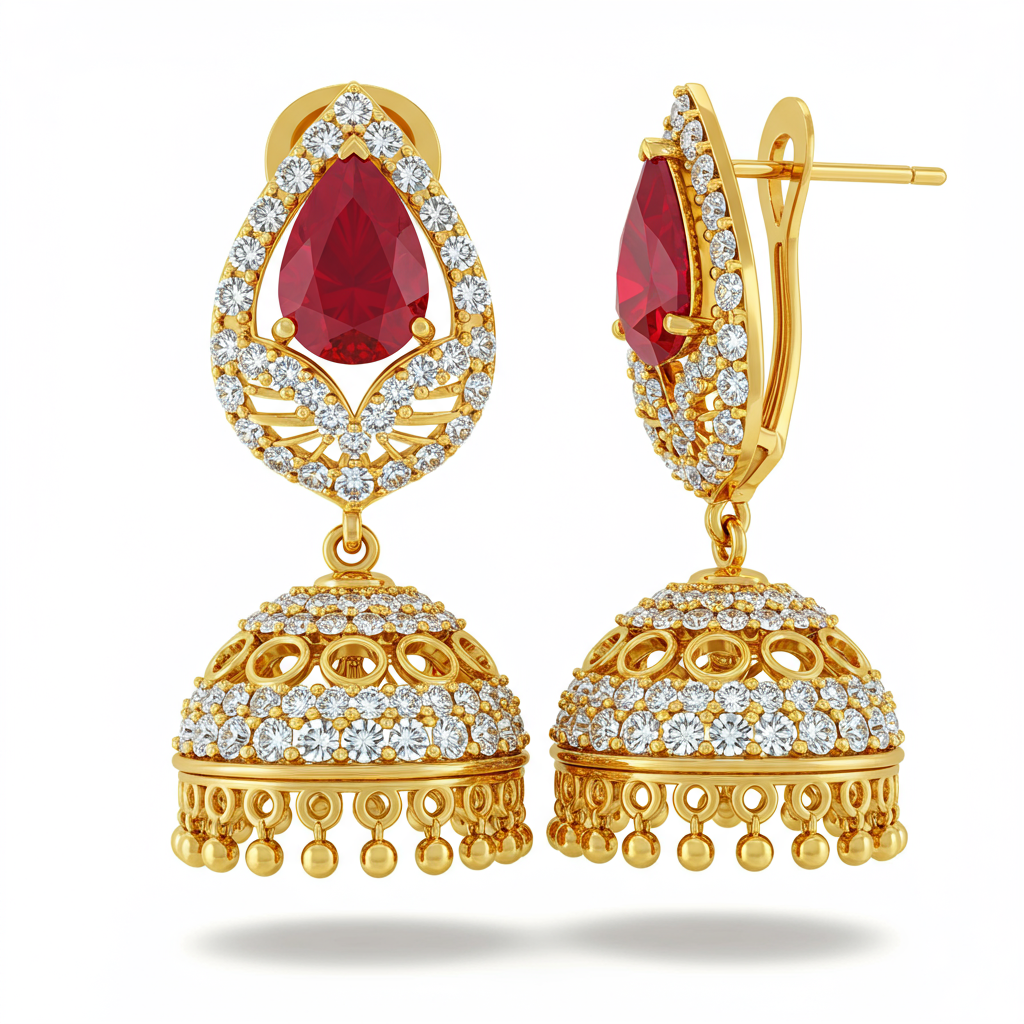 These majestic 18KT Yellow Gold earrings are exquisitely crafted to complement the grandeur of a traditional saree ensemble. They feature a stunning dome structure adorned with brilliant VVS diamonds set in intricate micro-pave work, leading to a vibrant, pear-shaped ruby drop. The detailed filigree work captures classic Indian jewelry artistry, ensuring dramatic sparkle and movement with every turn. Perfect for weddings and high-profile festive occasions, these statement pieces redefine ethnic luxury.