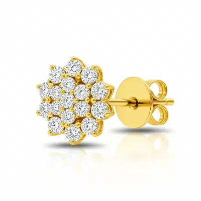 These exquisite gold diamond earrings feature a brilliant cluster design crafted in luxurious 18KT yellow gold, promising eternal glamour. Thirty-four precision-cut VVS diamonds are meticulously set to maximize light return and sparkle. The timeless circular silhouette provides a bold, yet comfortable statement suitable for any occasion, from an elegant evening out to sophisticated daily wear. Combining high-quality metal and superior diamond specifications, these studs are a true hallmark of enduring luxury.