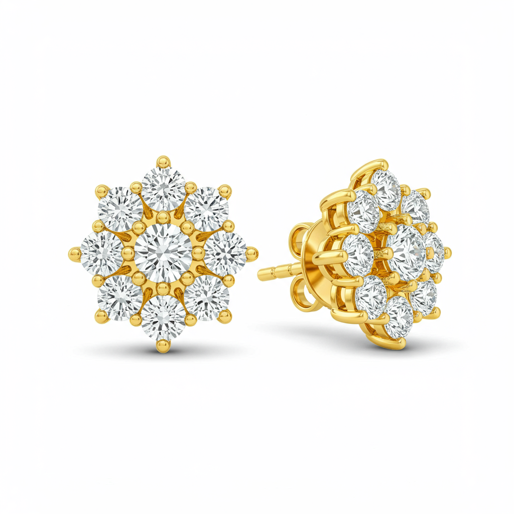 These exquisite 18KT yellow gold cluster earrings redefine everyday luxury with their sophisticated design. Each piece is meticulously crafted, showcasing a brilliant array of VVS diamonds set in a stunning floral cluster pattern. The timeless design provides a spectacular light performance, perfect for sophisticated daytime wear or elegant evening events. A true statement of classic femininity and refined taste, these earrings are designed for the modern woman who values unparalleled quality and finish.