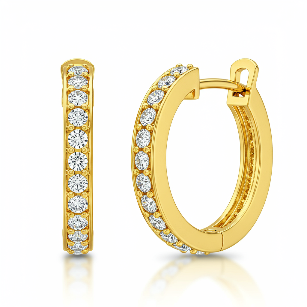 These exquisite gold ring earrings define sophisticated luxury, crafted from radiant 18KT yellow gold. A continuous line of brilliant VVS diamonds is meticulously set along the outer edge, maximizing sparkle from every angle. The seamless hinged closure ensures comfortable all-day wear while maintaining a sleek, uninterrupted silhouette. They are the perfect statement piece, effortlessly transitioning from daywear to evening elegance.