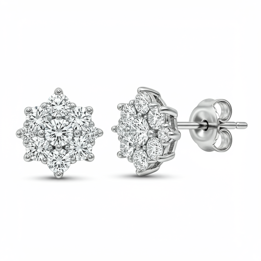 These exquisite cluster stud earrings redefine everyday luxury. Crafted in radiant 18KT white gold, they feature a stunning arrangement of twenty brilliant round diamonds set closely together to maximize sparkle. The meticulous design gives the powerful illusion of a much larger solitaire, providing magnificent visual impact. Secure screw-backs ensure comfortable and worry-free wear, making them perfect for both day and evening glamour.