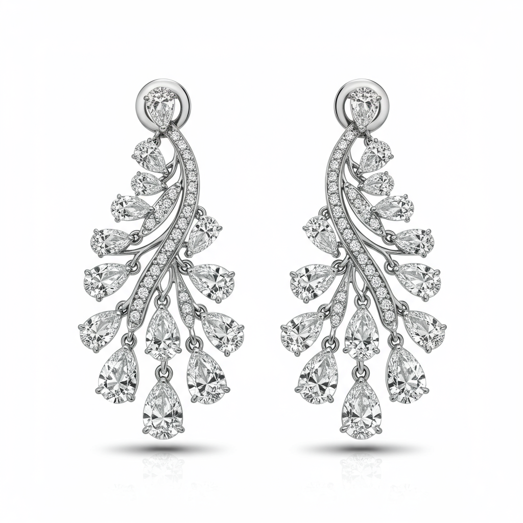 These spectacular statement earrings capture the essence of red carpet glamour with their sweeping, elongated design. Crafted in luminous 18KT white gold, they feature an intricate arrangement of large pear-shaped drops bordered by dazzling micropavé diamonds. The exceptional brilliance provided by over five carats of VVS diamonds ensures maximum light reflection from every angle. Perfect for black-tie events, these earrings are a timeless heirloom piece designed to command attention.