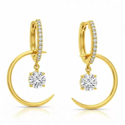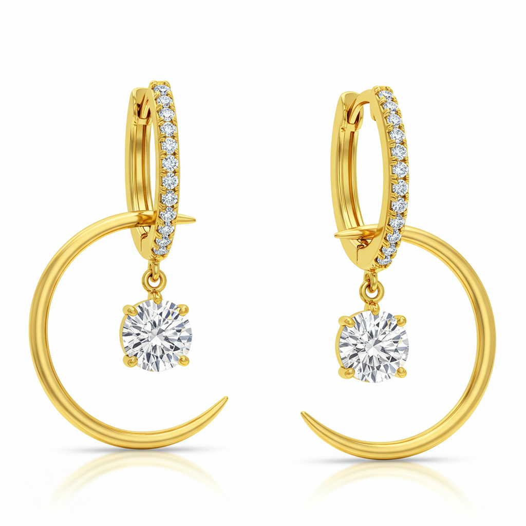 These magnificent big earrings redefine modern glamour, featuring dramatic drops encrusted with brilliant-cut diamonds. Crafted in luxurious 18KT gold, the design utilizes a high-polish finish to maximize sparkle and presence. Each earring showcases a substantial VVS diamond at its core, creating an unparalleled light performance suitable for any grand occasion. The sophisticated architecture and generous size ensure they are a timeless statement piece.