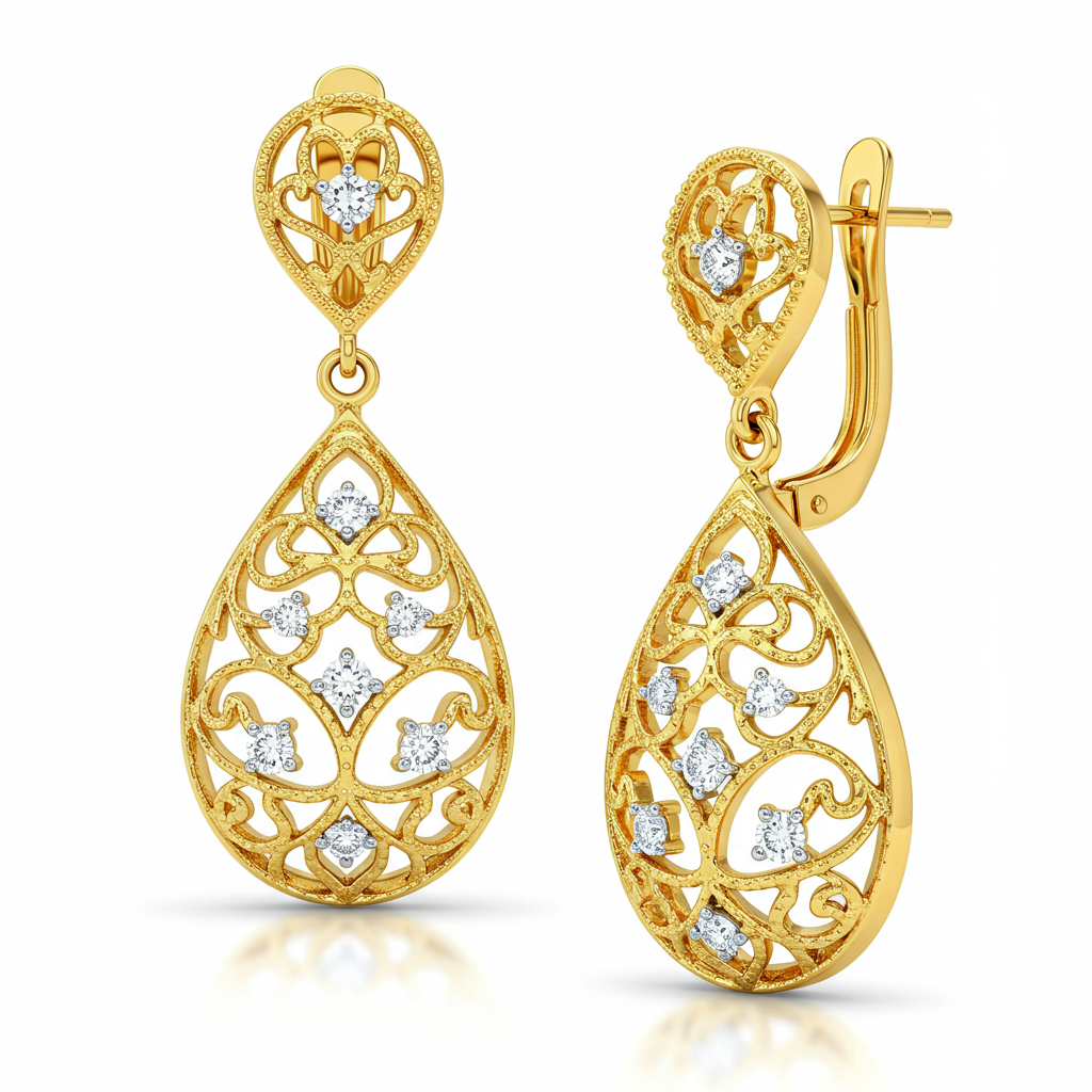 These fancy gold earrings are a masterful showcase of traditional craftsmanship blended with modern elegance. Expertly crafted in rich 18KT yellow gold, they feature delicate filigree work that enhances their voluminous drop silhouette. Adorned with brilliant VVS and VS diamonds, these earrings capture and reflect light with every movement. They are the quintessential accessory for formal events, offering timeless sophistication and grandeur.