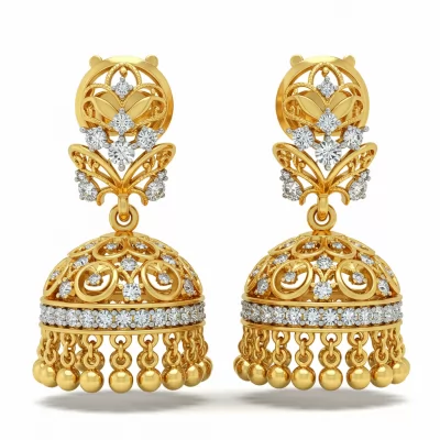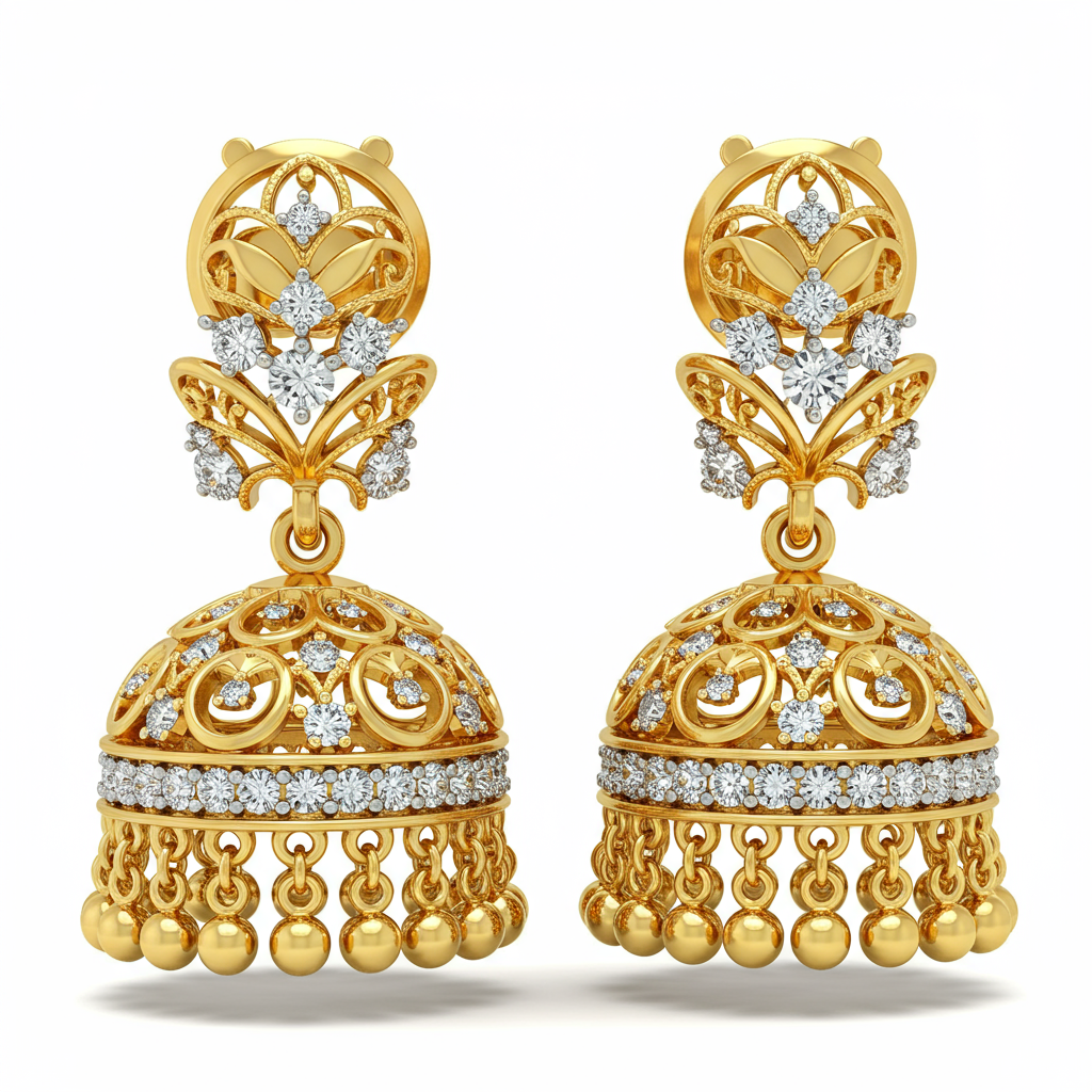 These exquisite Jhumka earrings redefine traditional elegance with a contemporary sparkle. Crafted in radiant 18KT yellow gold, the delicate dome structure is meticulously detailed with micro-pave set diamonds. The stunning silhouette captures the grandeur of Indian heritage while offering unmatched lightweight comfort and movement. Perfect for weddings, grand festive occasions, and making a timeless luxury statement.
