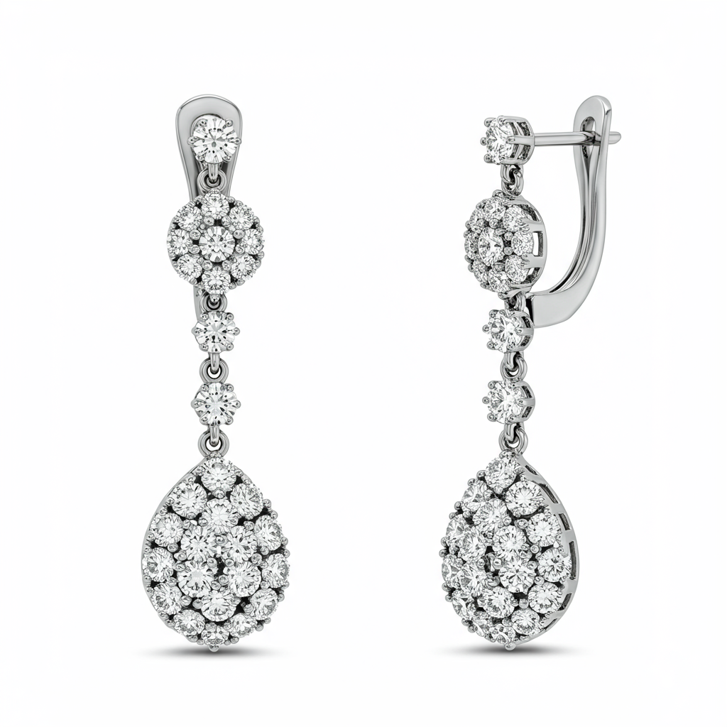 These exquisite hanging earrings embody timeless elegance and sophisticated movement. Crafted in luminous 18KT white gold, each drop showcases a brilliant stream of meticulously set VVS diamonds. The design offers captivating articulation, ensuring the stones catch the light with every turn of the head. Perfect for gala events or elevating everyday attire, these earrings define luxurious grace.