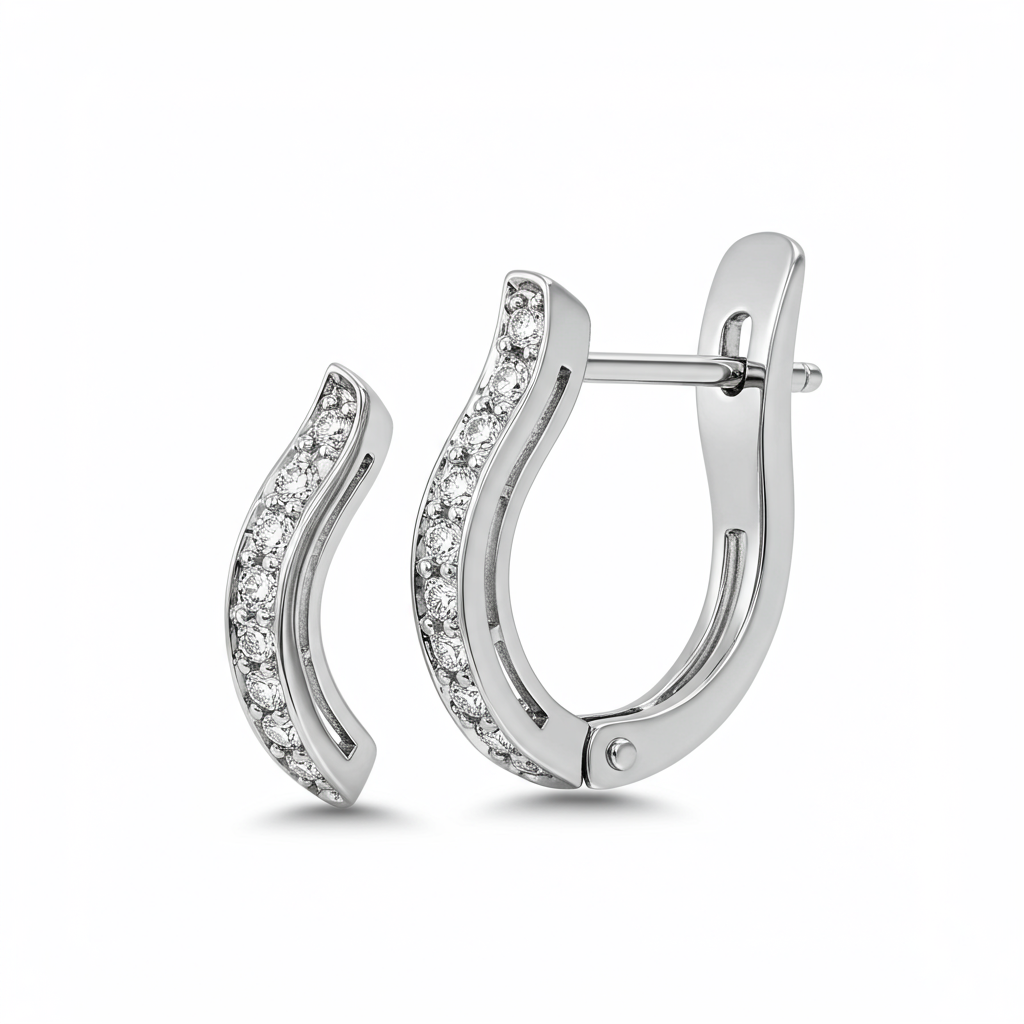 These sculptural side earrings are meticulously crafted to hug the natural curve of the ear, creating a continuous line of brilliance. Set in lustrous 18KT white gold, the design features a dynamic arrangement of precision-cut diamonds. The piece balances bold modern design with timeless elegance, offering maximum sparkle from every angle. It is an exceptional choice for those seeking contemporary high-fashion jewelry.
