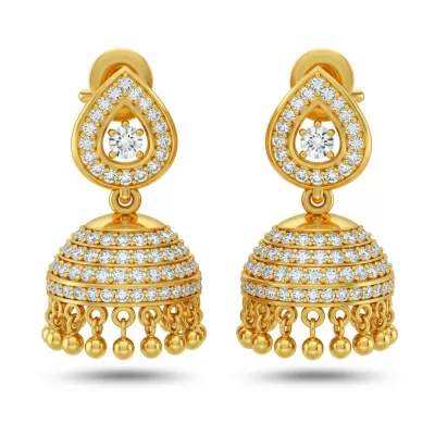 These elegant small jhumka earrings redefine traditional jewelry with modern brilliance. Crafted in lustrous 18KT yellow gold, the delicate dome structure is meticulously hand-set with scintillating VVS diamonds. The compact size ensures comfortable daily wear while providing significant sparkle and movement. These earrings are a timeless investment, perfect for transitioning effortlessly from daytime elegance to evening glamour.