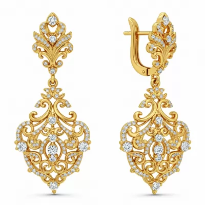 These traditional chandelier earrings capture the grandeur of ancestral craftsmanship, meticulously handcrafted in rich 18KT yellow gold. Featuring intricate filigree work and a stunning cascade of brilliant-cut diamonds, they evoke timeless elegance perfect for bridal or ceremonial occasions. The design balances significant visual presence with comfortable wearability, making them a breathtaking statement piece.