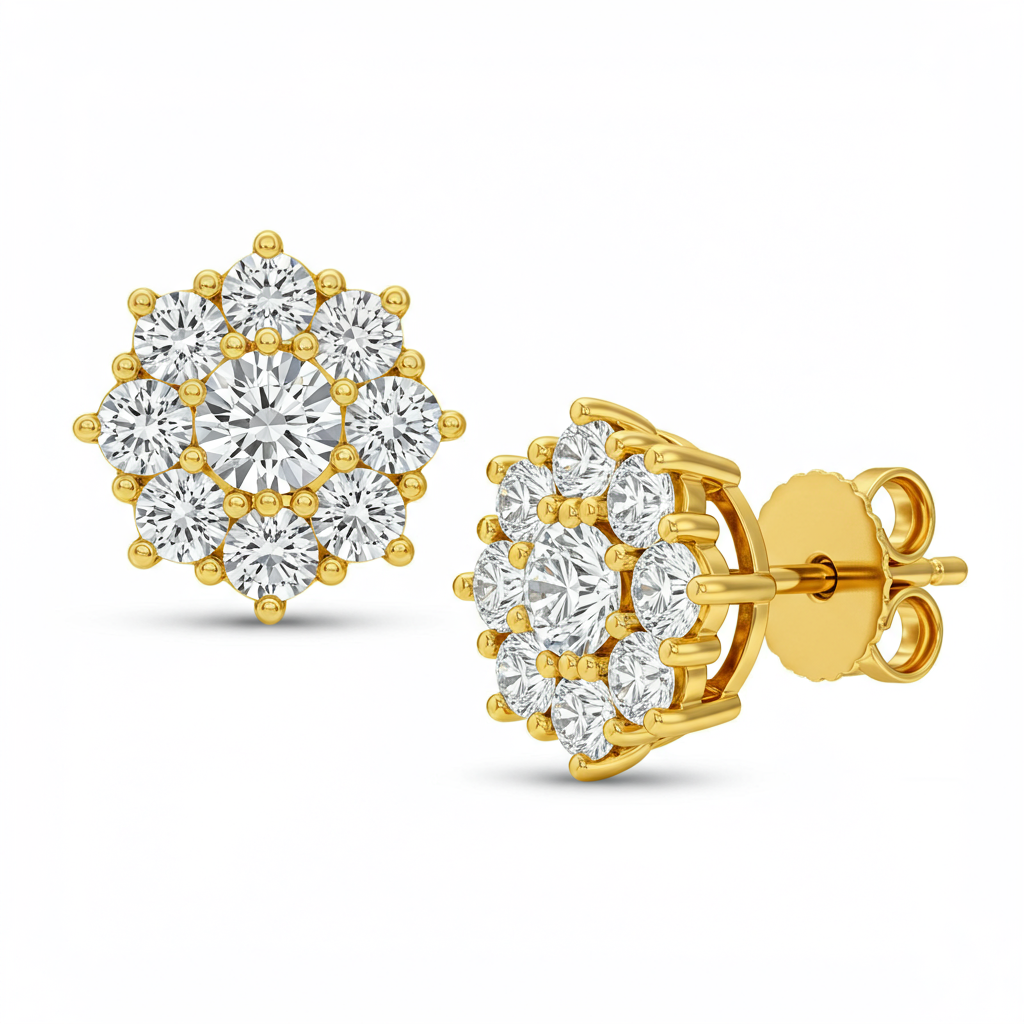 These elegant gold earrings embody modern sophistication, crafted in polished 18KT yellow gold. Featuring a brilliant cluster of high-quality VVS diamonds, they capture light from every angle, providing unmatched sparkle and depth. The intricate setting ensures maximum security while maintaining a delicate, refined silhouette. Perfect for both daily luxury and significant evening events, these studs are a timeless addition to any fine jewelry collection.