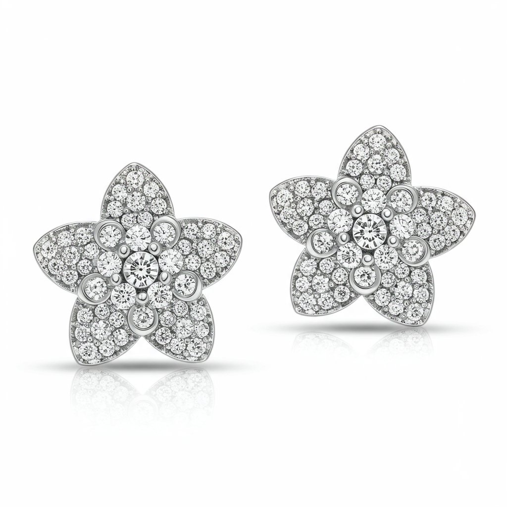 These exquisite flower earrings capture the essence of nature's delicate beauty in brilliant 18KT white gold. Each petal is meticulously set with VVS clarity diamonds in a cluster arrangement, maximizing fire and brilliance. The sophisticated design offers a stunning sparkle, transitioning effortlessly from daytime elegance to evening glamour. Perfect for commemorating special occasions, these earrings are a timeless addition to any fine jewelry collection.