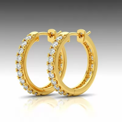 These luxurious 18KT yellow gold hoop earrings redefine everyday elegance with their flawless construction and timeless appeal. Each hoop is meticulously set with brilliant VVS round diamonds, creating a continuous circle of unparalleled sparkle and radiance. The robust, secure hinge closure ensures comfortable all-day wear and maximum durability. They serve as a sophisticated, versatile staple piece, transitioning seamlessly from daytime wear to glamorous evening affairs. This pair is the perfect embodiment of modern luxury.