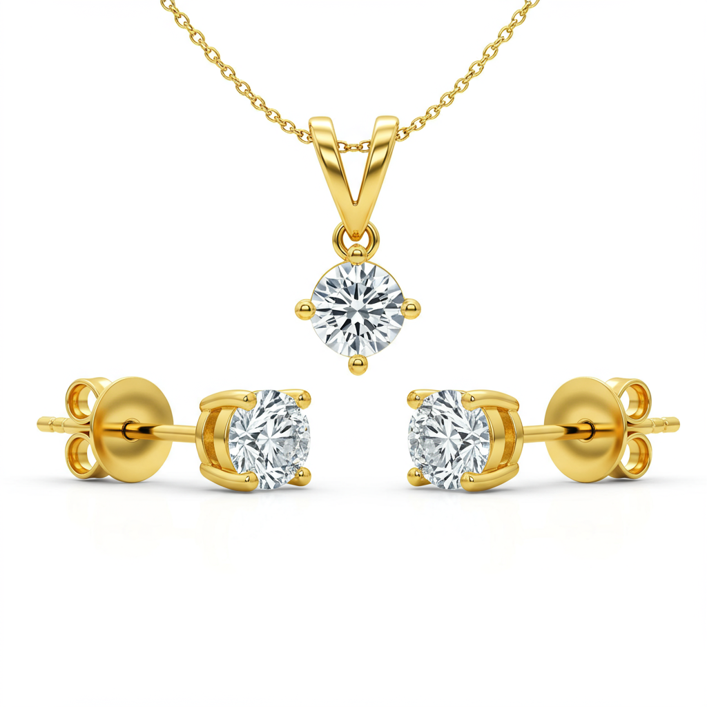 This exquisite pendant set includes a dazzling round diamond solitaire pendant complemented by perfectly matched stud earrings, all crafted in radiant 18KT yellow gold. Each piece features brilliant VVS grade diamonds meticulously set in minimalist four-prong mountings to maximize light return and sparkle. The timeless design makes this set an indispensable addition to any high-end jewelry collection, offering effortless versatility. This set symbolizes eternal grace and sophisticated luxury, making it an ideal gift or personal indulgence.