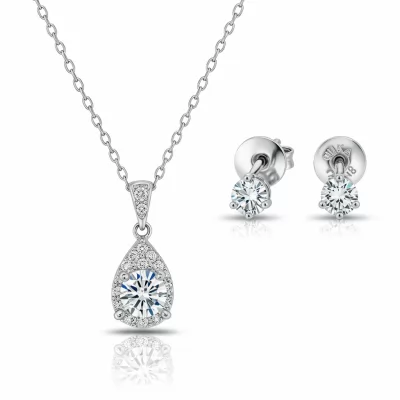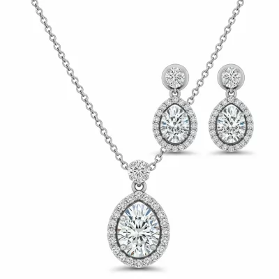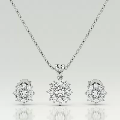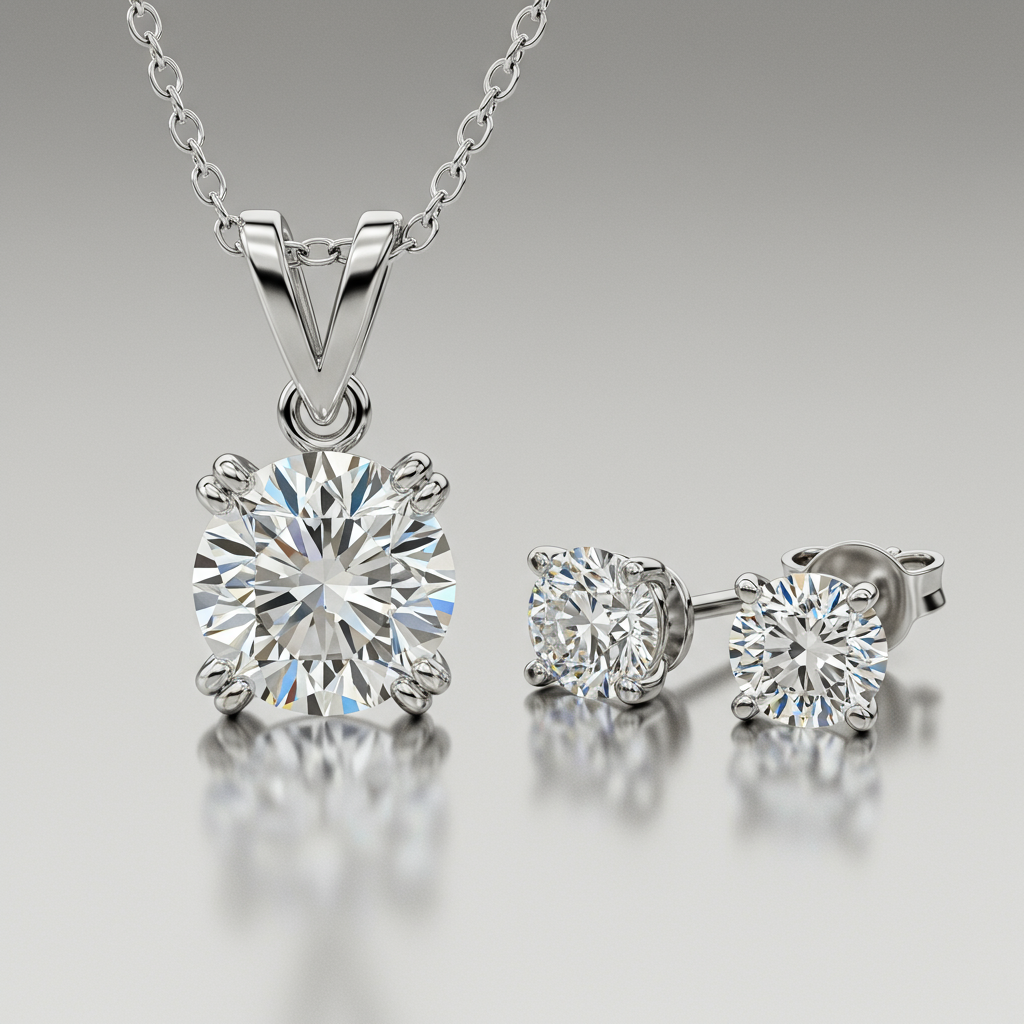 This elegant pendant and earring set defines refined luxury, showcasing perfectly matched, scintillating solitaire diamonds. Crafted in lustrous 18KT white gold, each piece features a magnificent center stone held by a secure four-prong setting. The timeless design ensures versatile wear, effortlessly transitioning from daytime sophistication to evening glamour. This matching trio represents the pinnacle of VVS diamond quality and masterful craftsmanship.