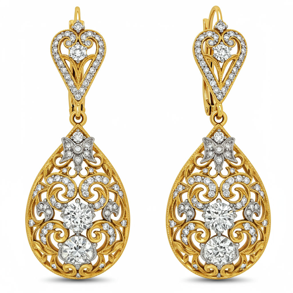 These breathtaking antique gold earrings capture the elegance of a bygone era with their intricate detailing and opulent design. Crafted in rich 18KT yellow gold, the elaborate filigree structure highlights the superior sparkle of the embedded diamonds. This substantial drop design offers dramatic movement and presence, making them the perfect centerpiece for any grand occasion. A true heirloom piece, they embody timeless luxury and masterful craftsmanship.