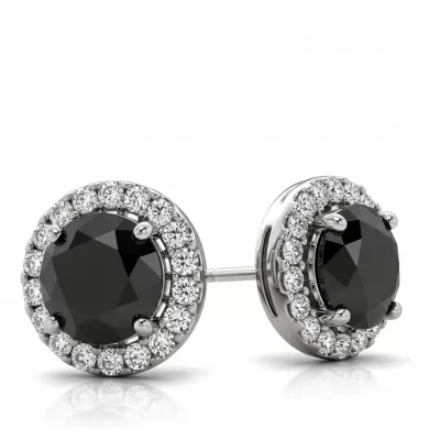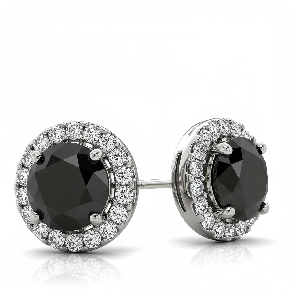 These elegant Black Diamond Stud Earrings capture sophisticated minimalism and modern luxury. Crafted in luminous 18KT white gold, each earring features a striking 5.0mm round Fancy Black diamond at its core. This central gem is dramatically framed by a delicate halo of brilliant G-color accent diamonds set in micro-pave. The meticulous VVS clarity side stones enhance the depth and brilliance of the overall design, making these studs an exquisite accessory. Perfect for adding a touch of edgy glamour, these high-quality studs transition effortlessly from daywear to evening chic.