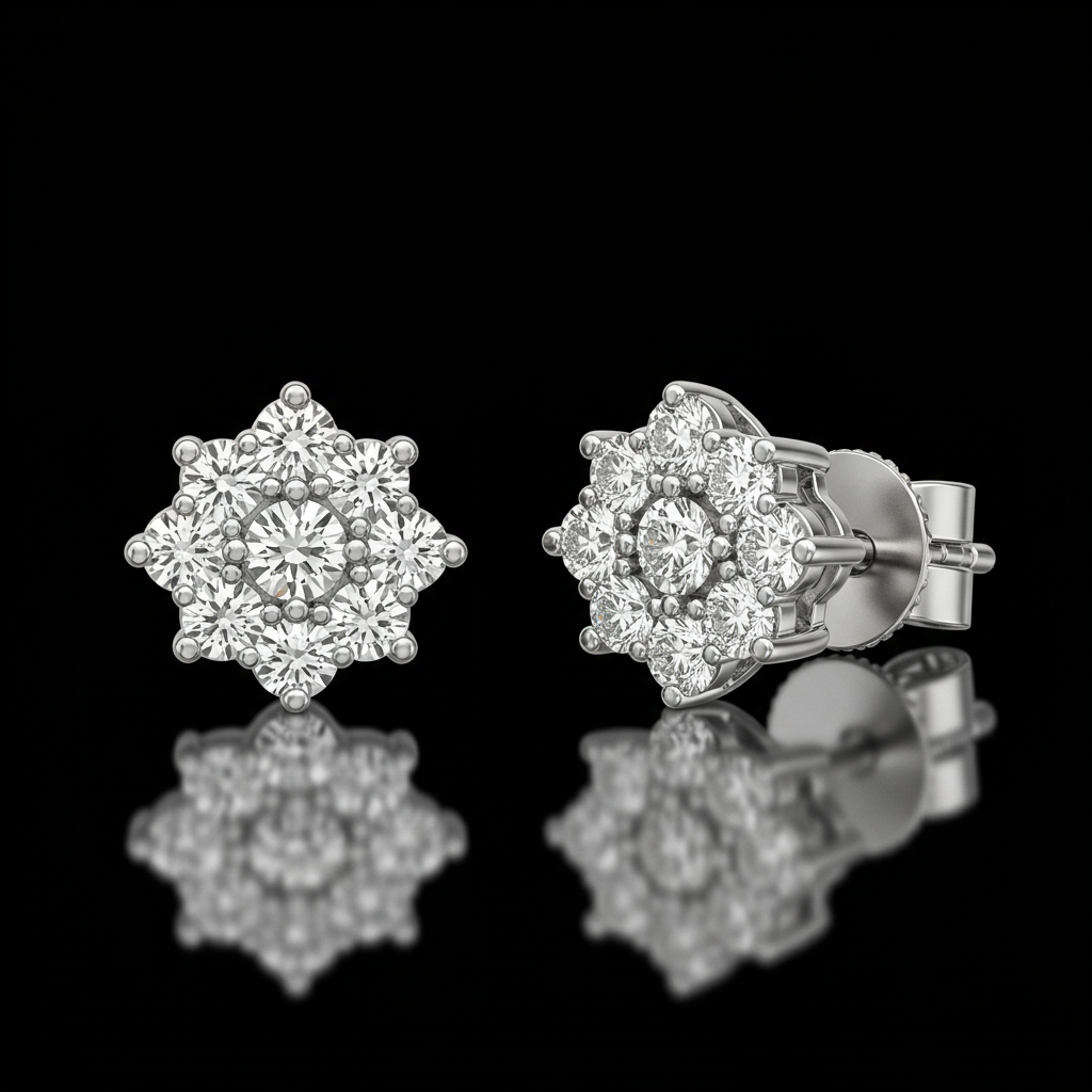 These charming cluster earrings capture light beautifully in a petite, elegant design. Crafted in luminous 18KT white gold, they feature a delicate arrangement of twenty high-clarity VVS round diamonds centered around a focal point. This piece offers everyday wearability with sophisticated sparkle, making them an ideal gift or personal indulgence. The secure friction back posts ensure comfortable and worry-free wear throughout the day.