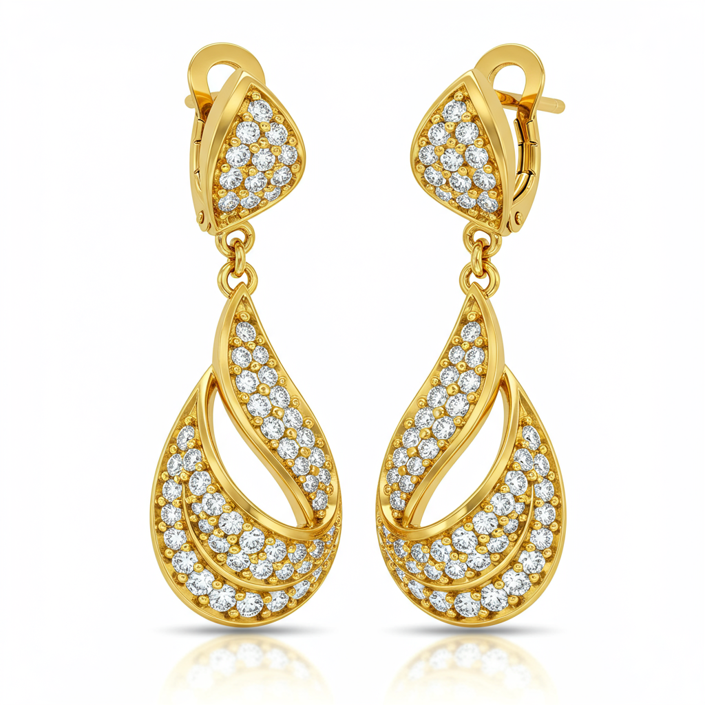 These exquisite handmade drop earrings capture the essence of artisanal luxury, featuring fluid lines of 18KT yellow gold. Each earring is meticulously crafted to ensure perfect balance and dynamic movement, resulting in a truly unique, sculptural form. They are adorned with brilliant-cut VVS diamonds, strategically set to maximize sparkle and radiance in every light. This stunning pair offers a sophisticated blend of traditional craftsmanship and elevated modern elegance, ideal for making a distinct statement.