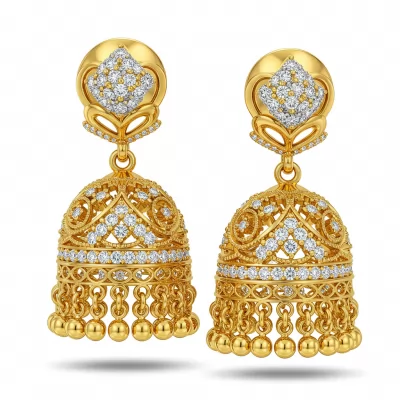 These magnificent jhumka earrings capture the essence of traditional Indian artistry combined with modern luxury. Crafted in radiant 18KT yellow gold, the dome shape is meticulously detailed with intricate lattice work and set entirely with brilliant cut diamonds. The rhythmic movement of the delicate diamond fringe adds an unparalleled sparkle. Perfect for grand occasions, these earrings are a statement piece that celebrates heritage and glamour.