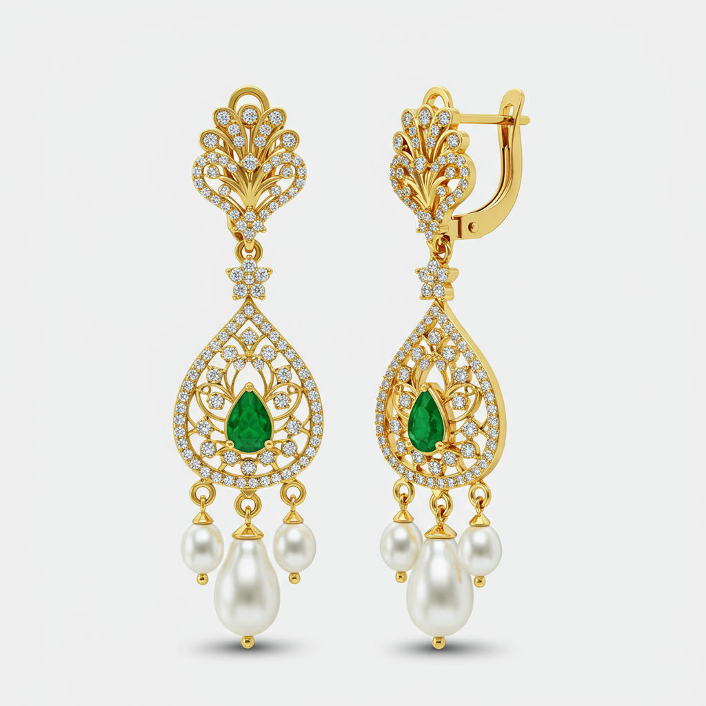 These Kashmiri Earrings are an ode to majestic traditional artistry, featuring intricate gold filigree work that enhances their impressive volume. They showcase brilliant VVS diamonds set in a stunning floral pattern, complemented by deep green emerald drops and luminous baroque pearl accents. Crafted meticulously in rich 18KT yellow gold, these chandelier drops capture the regal elegance of the Himalayas. This breathtaking statement piece is designed for the most grand and memorable occasions.