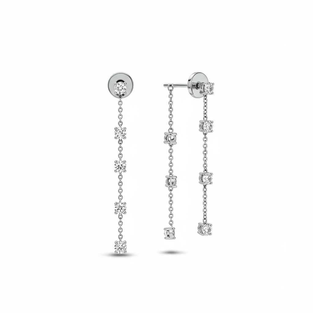 These ethereal threader earrings offer a modern interpretation of classic diamond elegance. Crafted in polished 18KT white gold, the fine chain smoothly slides through the piercing, culminating in a delicate bar adorned with brilliant VVS diamonds. The minimalist design provides versatility, allowing the wearer to adjust the drop length for a personalized look. Effortlessly chic and endlessly comfortable, they are perfect for everyday luxury or evening sophistication.
