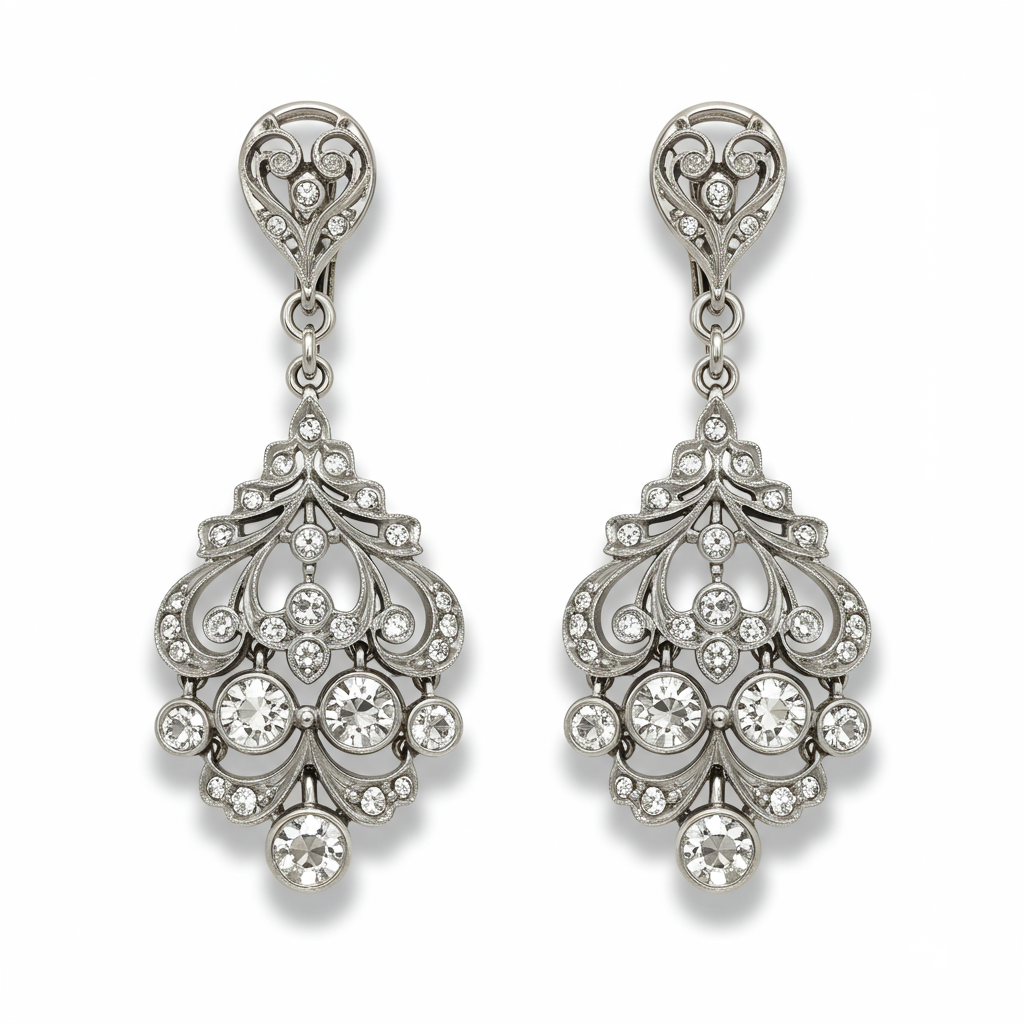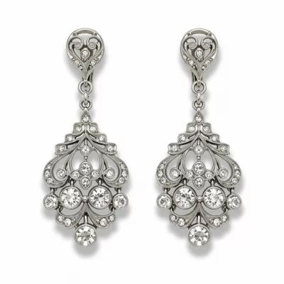 These exquisite antique earrings capture the grandeur of the Edwardian era with their delicate filigree and meticulous diamond setting. Crafted in polished 18KT white gold, the cascading design features brilliant-cut diamonds complemented by striking rose-cut accents, lending an heirloom quality. They are a timeless statement piece, perfect for formal occasions and those who cherish historical elegance and sophistication. The detailed milgrain work highlights the craftsmanship inherent in true antique revival jewelry.