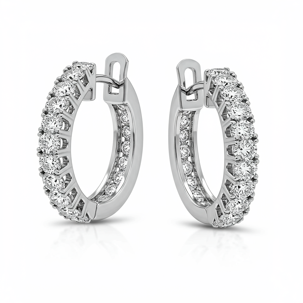 These exquisite diamond hoop earrings define modern luxury, crafted in radiant 18KT white gold. The elegant silhouette is completely covered in meticulously set brilliant round diamonds in a continuous pave setting. This ensures maximum sparkle and fire from every angle, making them perfect for both significant events and sophisticated daily wear. Secure locking mechanisms provide comfort and peace of mind while showcasing exceptional craftsmanship and timeless style.