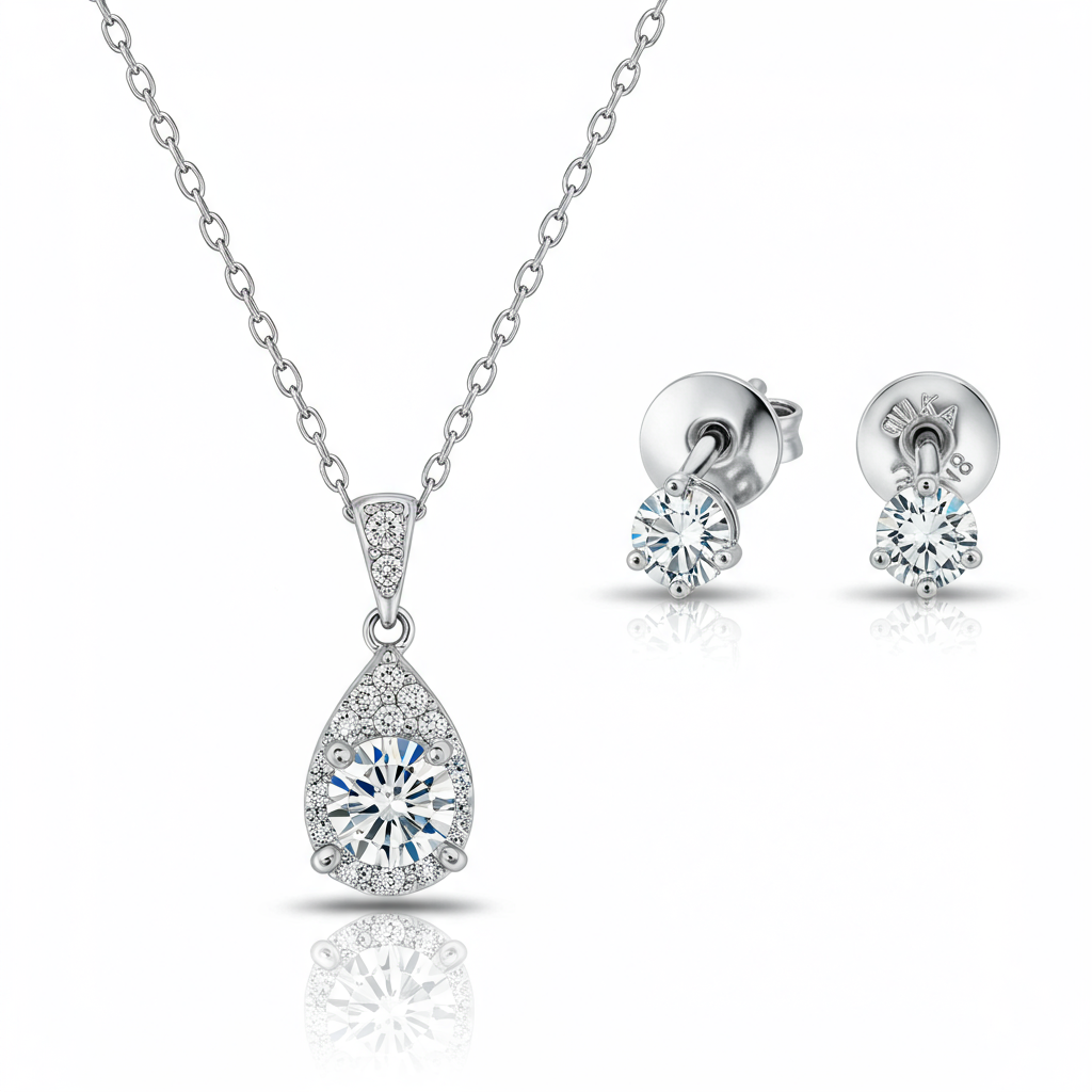 This exquisite diamond necklace and earring set embodies timeless elegance, combining two essential pieces into one luxurious collection. Crafted in luminous 18KT white gold, the collection features brilliant round diamonds meticulously set to maximize light return and scintillation. The central necklace showcases a delicate drop design, perfectly complemented by matching high-carat diamond stud earrings. This versatile set is the ultimate statement of sophisticated glamour, ideal for grand occasions or as a cherished heirloom gift.