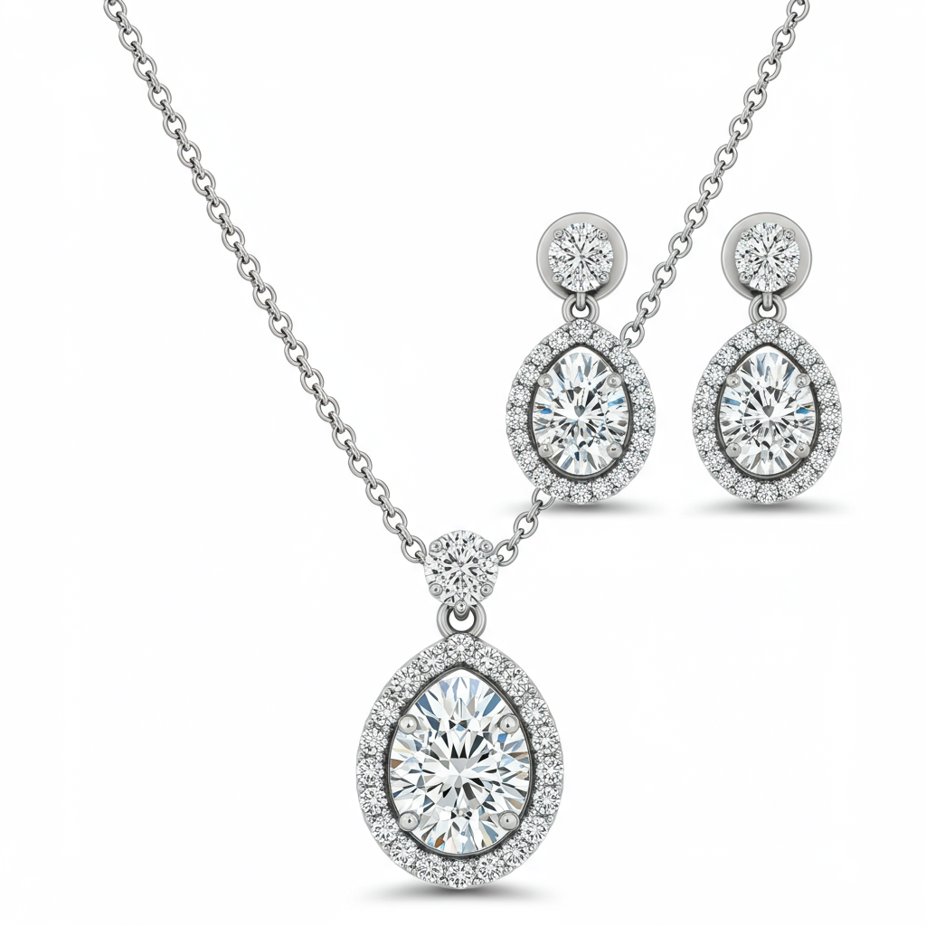 This exquisite necklace and earring set epitomizes timeless sophistication, meticulously crafted in radiant 18KT white gold. The central focal points feature brilliant round diamonds framed by delicate halos of smaller pave stones, maximizing sparkle and presence. The matching drop earrings complement the necklace perfectly, offering synchronized brilliance. This set is ideal for grand occasions, ensuring an unforgettable statement of luxury and elegance.