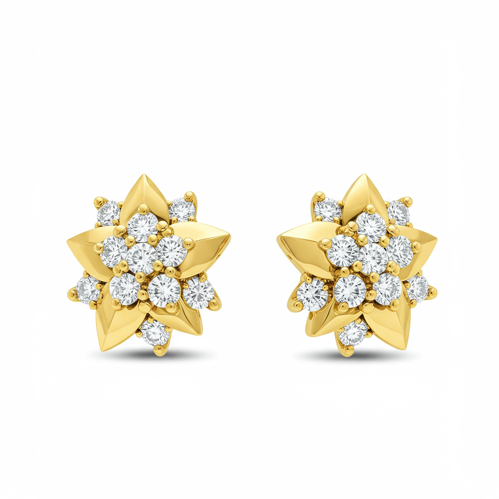 These exquisite cluster diamond studs are meticulously crafted in radiant 18KT yellow gold, offering timeless elegance. Featuring a captivating array of VVS brilliant round diamonds, the design maximizes brilliance and fire in a classic silhouette. The intricate setting technique creates the illusion of a single, larger solitaire stone, delivering maximum sparkle for minimal weight. Perfect for daily wear or an evening statement, these earrings are essential additions to any discerning jewelry collection.