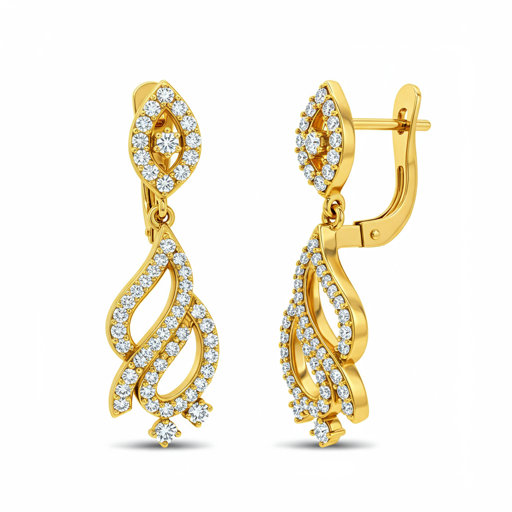 These elegant gold hanging earrings redefine sophistication with their fluid movement and radiant finish. Crafted in luminous 18KT yellow gold, they feature a delicate, articulated structure designed to capture light with every turn. Each element is meticulously set with brilliant VVS round diamonds, creating a continuous stream of sparkle. These stunning drops are perfect for evening wear or adding a dramatic flair to professional attire, offering timeless luxury and impeccable design.