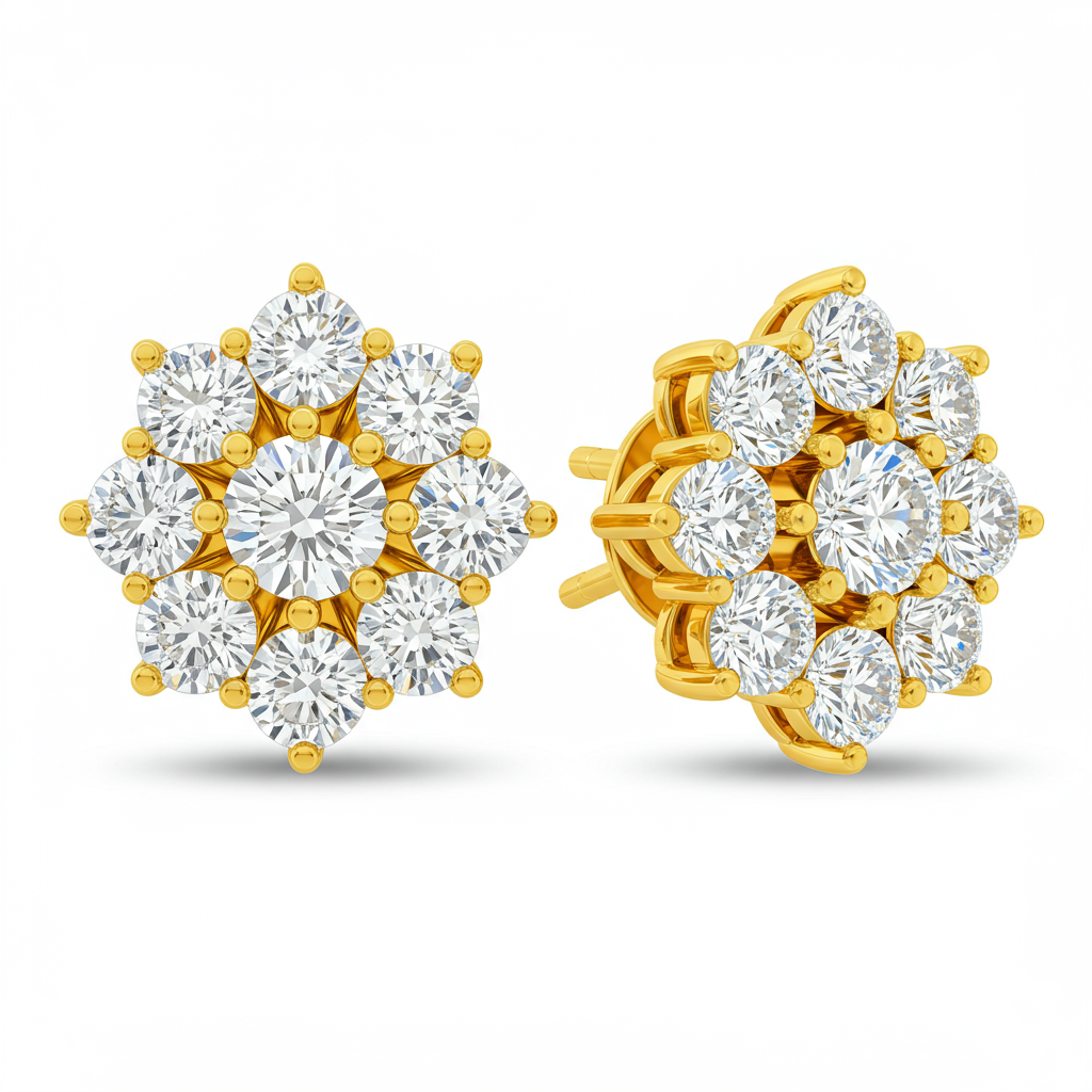 These exquisite 18KT yellow gold cluster earrings redefine everyday luxury. Featuring a radiant central cluster of brilliant round diamonds, they capture light from every angle, creating a dazzling effect. The meticulous prong setting showcases the stones' VVS clarity and G-H color perfectly, ensuring maximum brilliance. Secured with robust push-backs, these studs offer both timeless glamour and comfort for daily wear. They are the perfect signature accessory for sophisticated elegance.