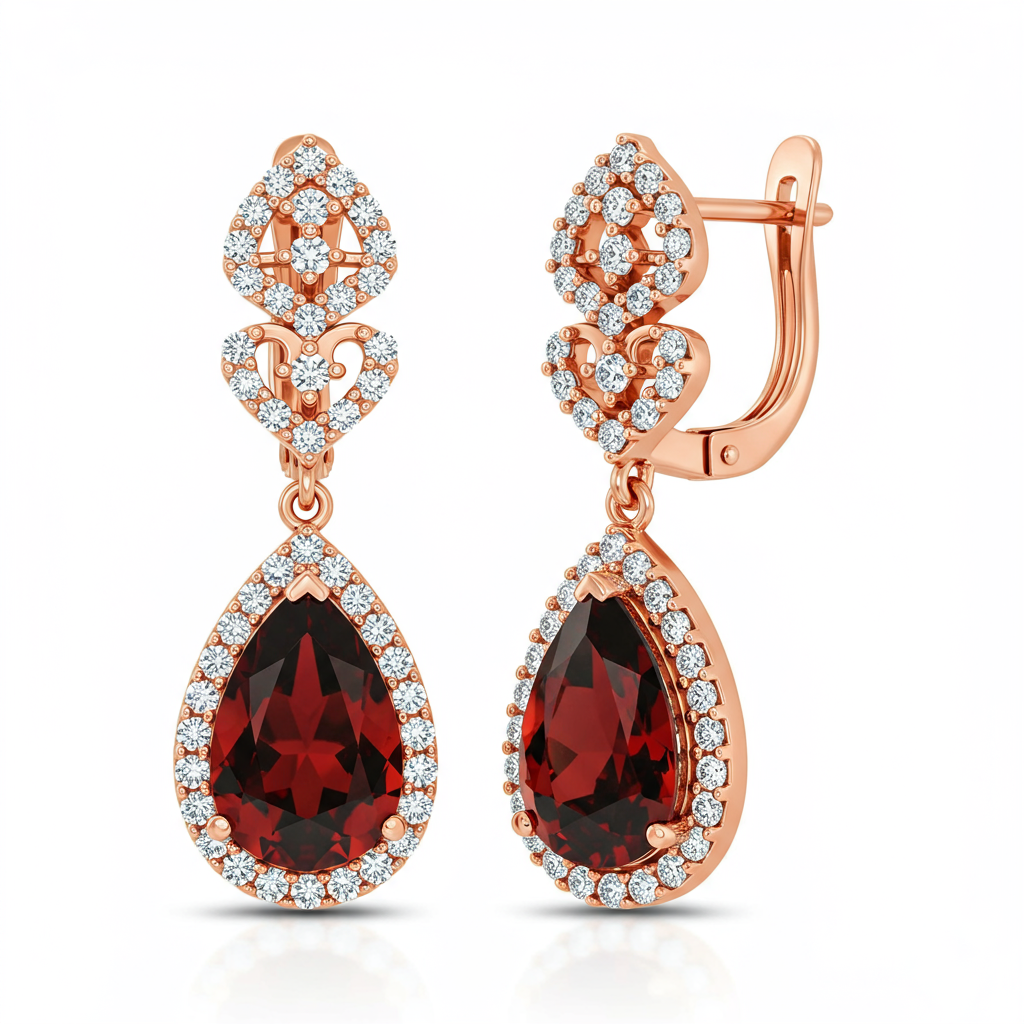 These elegant maroon earrings capture the essence of deep romance and luxury. Crafted in radiant 18KT rose gold, they feature stunning central pear-cut Mozambique garnet stones surrounded by a delicate halo of brilliant-cut diamonds. The intricate setting ensures maximum light performance, offering unparalleled sparkle with every movement. These sophisticated drop earrings are the perfect statement piece for high-society events or glamorous evening wear.