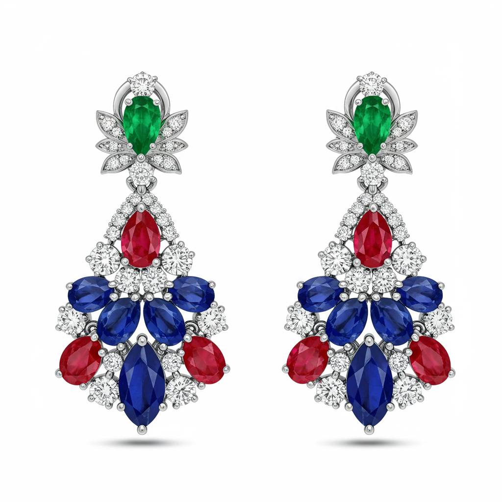 These exquisite drop earrings are a vibrant celebration of color and light, meticulously crafted in radiant 18KT white gold. Featuring a harmonious arrangement of premium diamonds, rubies, sapphires, and emeralds, they capture the essence of luxurious asymmetry. The precision pave and prong settings ensure maximum brilliance, allowing each gemstone to radiate its unique hue. Designed for the discerning collector, these earrings promise to be a captivating centerpiece for any grand occasion.