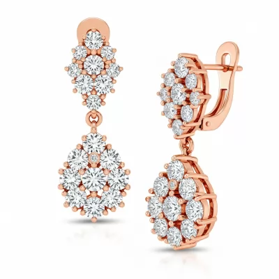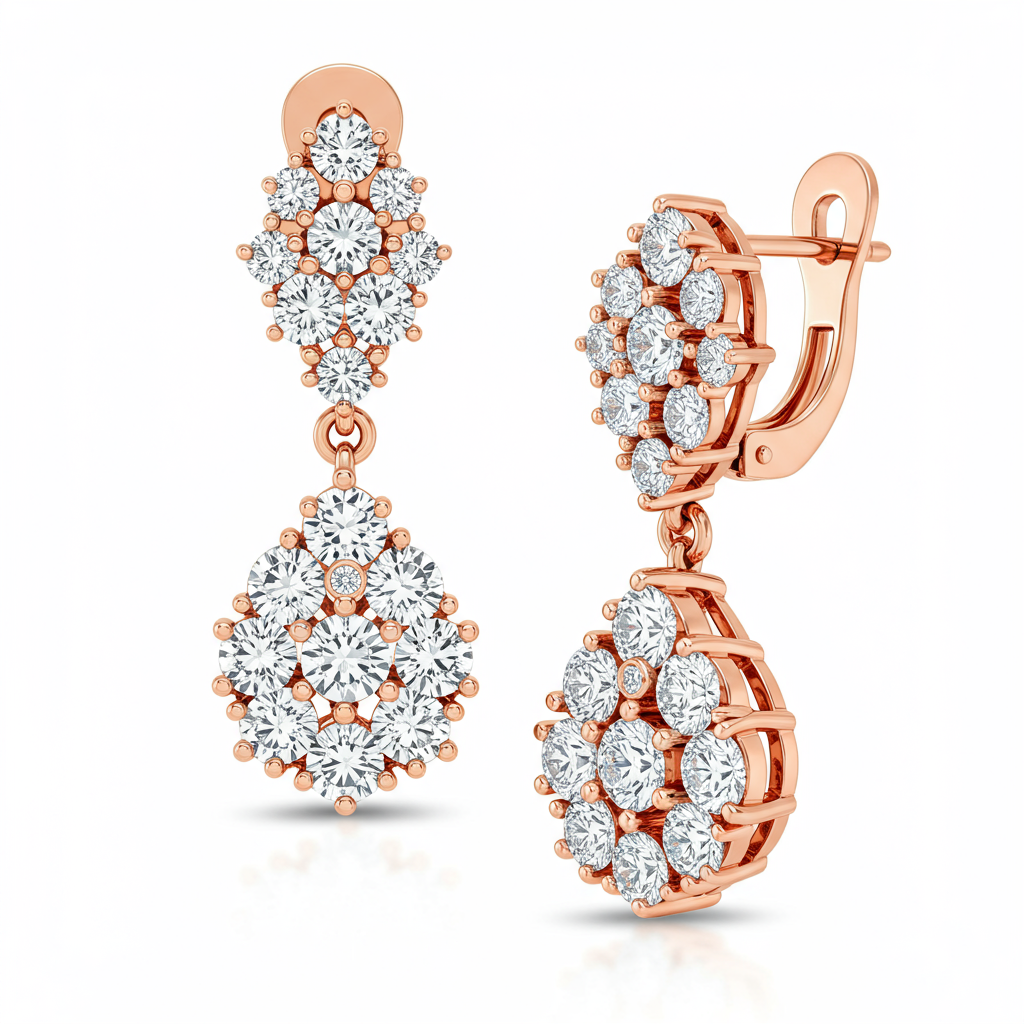 These Tanishq-inspired diamond drop earrings embody timeless elegance and sophisticated luxury. Crafted in radiant 18KT Rose Gold, the design features a captivating structure where brilliant VVS round diamonds are meticulously pave-set and clustered to maximize light return. The fluid, delicate movement enhances the sparkle, making these earrings perfect for grand events or discerning daily wear. This exquisite piece combines traditional artistry with contemporary design flair, offering unparalleled brilliance and lasting value.