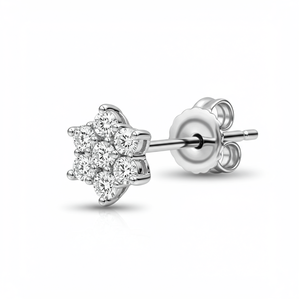 These adorable stud earrings are crafted in luminous 18KT white gold, designed specifically for youthful elegance and comfort. Each piece showcases a cluster of brilliant VVS diamonds set in a delicate floral pattern, maximizing sparkle and presence. The secure friction backs ensure comfortable, all-day wear suitable for sensitive ears. This pair offers timeless, secure brilliance, making it the ideal luxury gift for celebrating a cherished young lady's milestone.