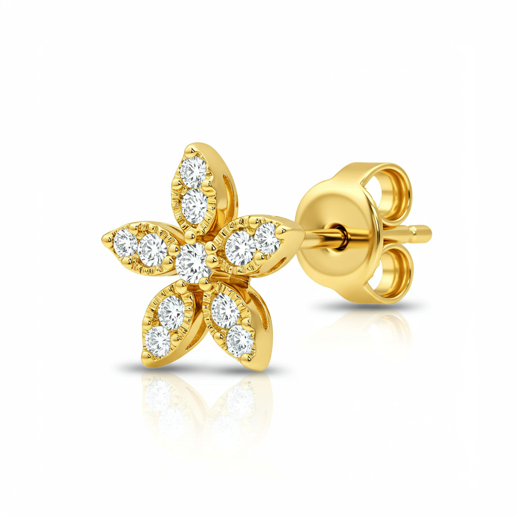 These delightful stud earrings capture the innocence and joy of youth, meticulously crafted in radiant 18KT yellow gold. Featuring a charming, minimalist floral design, each piece is accented with brilliant micro-pave diamonds that offer subtle yet striking sparkle. Lightweight and comfortable, they are perfectly sized for everyday wear, making them an ideal gift for young girls. The secure screw-back closure ensures safety and peace of mind for active wearers. This piece is a timeless keepsake designed to celebrate special milestones.