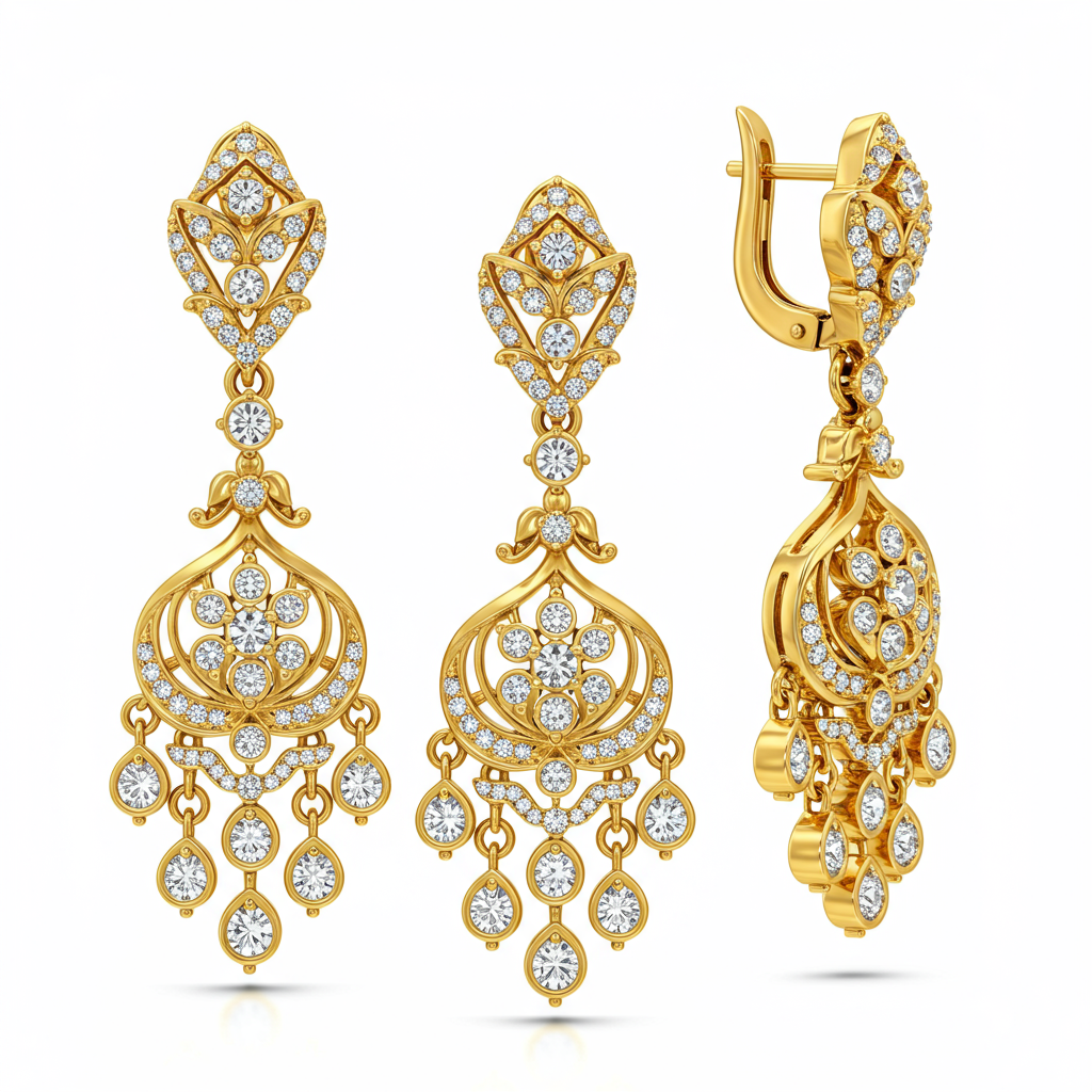 These majestic chandelier earrings are specifically designed to complement the grandeur of a traditional lehenga ensemble. Crafted in gleaming 18KT Yellow Gold, they cascade dramatically, catching light with every movement. They feature an intricate filigree design highlighted by exceptional VVS clarity diamonds set across multiple tiers. This piece seamlessly blends classic Indian aesthetics with contemporary high-jewelry precision, making it the perfect statement accessory for bridal or festive occasions.