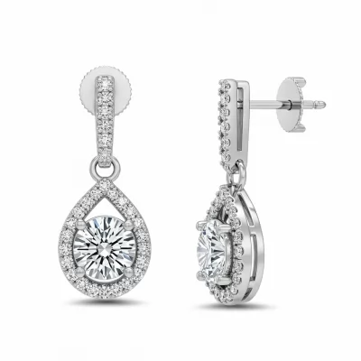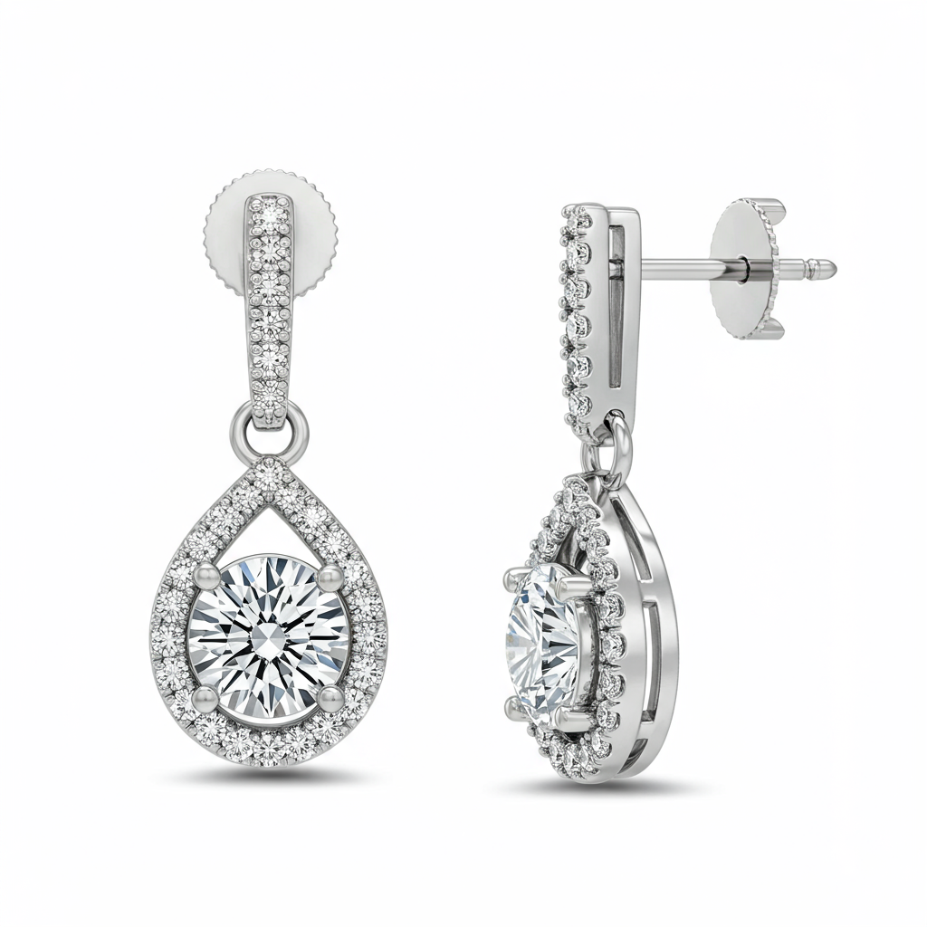 These stunning drop earrings redefine elegance with their sophisticated silhouette and brilliant diamond sparkle. Each earring features a mesmerizing 0.50 carat VVS round diamond, perfectly framed by a delicate halo of micro-pave accent stones. Crafted in luminous 18KT white gold, the design allows maximum light entry, enhancing the fire and brilliance of every stone. They are the quintessential accessory for achieving an effortlessly glamorous look for any major occasion.